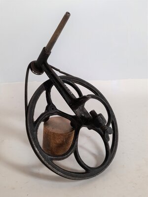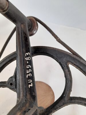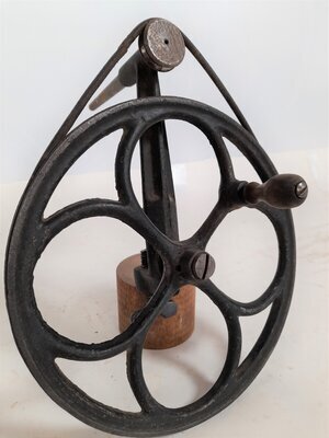 Dieses etwas kleinere ebenfalls aus Gusseisen hergestellte Spulrad besteht aus einer Schraubklemme, mit der es an einer Tischkante festgemacht werden konnte, und einem Antriebsrad mit einem Vierpass, dessen Achse genau an der Halterung sitzt. Angetrieben wird das Rad von einem auf einem Steg aufliegenen Handgriff mit Holzummantelung. Aus der Schraubklemme ragt ein hoher Mast heraus, auf dem die Halterung der Spindel sitzt. Ein in der Nut des großen Rades liegender Lederriemen treibt die Spindel an. Auf den metallenen Dorn der Spindel wird eine Papphülse gestülpt, hierauf der Faden aufgewickelt und die dann in das Weberschiffchen eingelegt wird. Aus der alten Inventarnummer "zu 359-83" geht hervor, dass es 1983 in das Museum kam und in einem Zubehörkonvolut zu einer Strickmaschine eingeliefert wurde. alte Inventarnummer