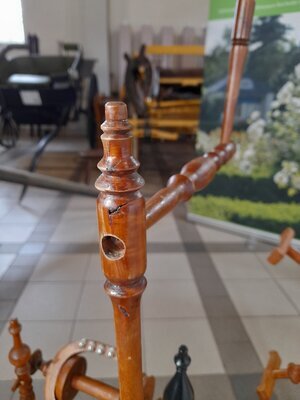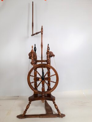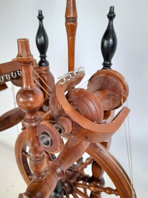 Dieses dekorative, reich gedrechselte und aus verschiedenfarbigen Hölzern zusammengesetzte Spinnrad ist in Bockbauweise mit zweifädigem Antrieb gebaut. Das besondere an ihm ist, dass es zwei Spinnvorrichtungen besitzt. Das heißt, dass das Antriebsrad gleich zwei Flügel antreibt und zwei Spulen bremst. Es ist für geübte Spinner durchaus möglich mit zwei Händen gleichzeitig zu spinnen und daher die doppelte Menge Garn zu produzieren. Häufig wurden diese Räder aber eingesetzt, um auf Hochzeiten Braut und Bräutigam gleichzeitig daran spinnen zu lassen, wobei aber nur einer den Tritt bedienen konnte und damit das Tempo vorgab. Der exterm hohe Rocken lässt die Vermutung zu, dass es sich bei dem Rad tatsächlich um einen Teil der Aussteuer gehandelt hat, bei der der üppig befüllte Rocken für eine reichhaltige Mitgift der Braut steht. Das Rad hat sehr wenige Abnutzungspuren im Holz, dafür ist der Lack des Holzes an einigen Stellen abgeschabt und aufgehellt, als hätte es im Regen gestanden.