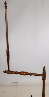 Dieses dekorative, reich gedrechselte und aus verschiedenfarbigen Hölzern zusammengesetzte Spinnrad ist in Bockbauweise mit zweifädigem Antrieb gebaut. Das besondere an ihm ist, dass es zwei Spinnvorrichtungen besitzt. Das heißt, dass das Antriebsrad gleich zwei Flügel antreibt und zwei Spulen bremst. Es ist für geübte Spinner durchaus möglich mit zwei Händen gleichzeitig zu spinnen und daher die doppelte Menge Garn zu produzieren. Häufig wurden diese Räder aber eingesetzt, um auf Hochzeiten Braut und Bräutigam gleichzeitig daran spinnen zu lassen, wobei aber nur einer den Tritt bedienen konnte und damit das Tempo vorgab. Der exterm hohe Rocken lässt die Vermutung zu, dass es sich bei dem Rad tatsächlich um einen Teil der Aussteuer gehandelt hat, bei der der üppig befüllte Rocken für eine reichhaltige Mitgift der Braut steht. Das Rad hat sehr wenige Abnutzungspuren im Holz, dafür ist der Lack des Holzes an einigen Stellen abgeschabt und aufgehellt, als hätte es im Regen gestanden.