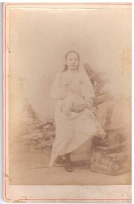 Zu sehen ist ein Mädchen, das ein weißes Kleid und einen weißen Schleier trägt. Sie hat den linken Fuß euf einen Stein gestellt. Die rechte Hand hält einen weißen Schirm. Wahrscheinlich ist dies ein Foto zur Erinnerung an die erste heilige Kommunion. Das Foto wurde auf ein Stück Pappe geklebt. Auf der Rückseite stehen die Worte Meelle (Mademoiselle) Renée Feit