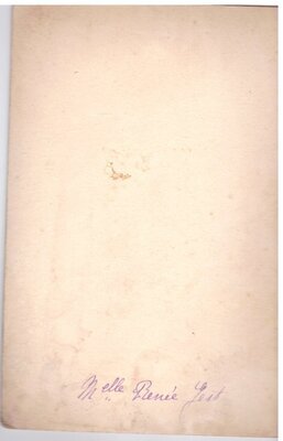 Zu sehen ist ein Mädchen, das ein weißes Kleid und einen weißen Schleier trägt. Sie hat den linken Fuß euf einen Stein gestellt. Die rechte Hand hält einen weißen Schirm. Wahrscheinlich ist dies ein Foto zur Erinnerung an die erste heilige Kommunion. Das Foto wurde auf ein Stück Pappe geklebt. Auf der Rückseite stehen die Worte Meelle (Mademoiselle) Renée Feit