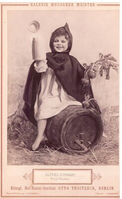 Zu sehen ist ein Kind, welches auf einem Fass sitzt. Die rechte Hand trägt einen gefüllten Bierkrug, die Linke hält zwei Pflanzen mit Wurzeln. Das Bild ist auf ein Stück Pappe geklebt. Unter dem Foto erscheint der Name des Künstlers. Auf der Rückseite steht eine persönliche Widmung sowie das Datum 27.10.97