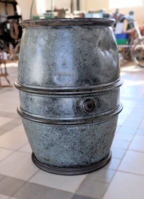 Ein Benzinfass, Hergestellt 1937, von der französischen Firma R.Behin aus Gennevilliers/Seine. Das Fass hat eine bauchige Form. Oben und unten abgeplattet, für einen sicheren Stand. In der Mitte umschließen zwei Verstärkungsringe den Bauch, zwischen denen der Füllstutzen liegt. Dieser kann nur mit einem Spezialschlüssel geöffnet werden. Auf der Oberseite ist das Herstellungsdatum erkennbar. (Juli 1937). Das Fass war beim Französischen Militär in Gebrauch.