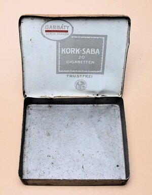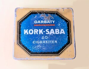 Zigarettenschachtel aus Blech für 20 Orient Zigaretten der Marke „Kork-Saba“. Hergestellt in den 1920/1930er Jahren in der Zigarettenfabrik Garbaty / Berlin Pankow. Die Blechpackung hat eine goldenen Grundton mit blau/schwarzem Etikett. In weißer Blockchrift steht auf dem Deckel, „Garbaty – Kork Saba, 20 Cigaretten“ Auf den Seiten findet sich ebenfalls der Markenname „ Garbaty Kork Saba“. Auf der hellen Innenseite des Deckels findet sich dergleiche Aufdruck, jedoch in Grau.