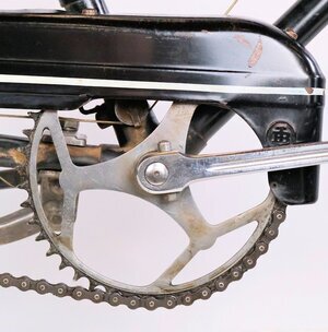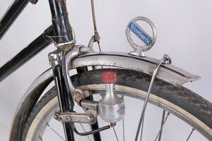 Das Damenrad aus der Fabrikation der Firma Bismarck hat die Produktionsnummer 1.635.190, woraus sich das Herstellungsjahr 1956 ableiten lässt. Rahmen und Gabel sind schwarz lackiert, die Schutzbleche dagegen, silbern mit zwei parallel laufenden dünnen, schwarzen Streifen. Auf dem Rahmen sind Abziehbilder mit dem Namenszug „Bismarck“ und dem Hinweis „ Das Siegerrad der Deutschlandfahrt“ angebracht. Ein Firmenlogo aus Metall, gestanzt bzw. gegossen, befinden sich am Steuerkopf, dem Vorderen und dem hinteren Schutzblech. Das Rad ist mit einer 3 Gang Nabenschaltung von Torpedo, Modell 55 ausgestattet, die über einen Kipphebel vom Lenkrad aus geschaltet wird. Zum Bremsen steht ein Rücktritt und eine Felgenbremse für das Vorderrad zur Verfügung. Unterhalb des Sattels hat der Hersteller einen runden Behälter, zur Aufnahme von Flick- und Werkzeug, eingebaut. Die Klingel ist noch Original und trägt ebenfalls das Firmenlogo. Das Rad wurde von uns restauriert und befindet sich in der neu eingerichteten Fahrradwerkstatt.