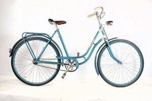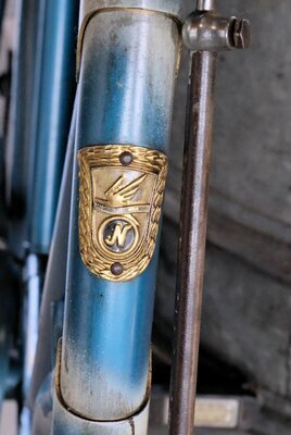 Das Großversandhaus Neckermann hatte auch Fahrräder in seinem Angebot. Unser Objekt ist ein Damenrad, in Stahlblau, mit dünnen gold-gelben Streifen, lackiert. Auf dem Rahmen ist ein Abziehbild mit dem Kürzel ""N"" für Neckermann und dem Hinweis ""Das große Deutsche Versandhaus"" Ein metallenes Steuerkopfschild in Wappenform ist an der Vordergabel angebracht. In dessen Zentrum steht das Kürzel "N" für Neckermann, darüber ein stilisierter Vogel, der in seinem Schnabel einen Wimpel mit der Aufschrift "Das große Deutsche Versandhaus" trägt. Die Hinterrad Nabe ist von Fichtel und Sachs Typ Komet. Gebremst wir das Rad mit Rücktritt und einer Stempelbremse. Von der Beleuchtung ist der Scheinwerfer Marke Neckermann vorhanden, dagegen fehlt der Dynamo. Das Rad wurde von uns teilrestauriert und befindet sich in der historischen Fahrradwerkstatt.