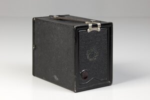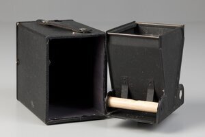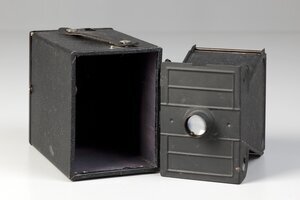 Die Boxkamera wurde 1888 von Kodak in den USA entwickelt, erst mit Glasplatten, ab 1901 mit 6 X 9/120ziger Rollfilmen. Mit diesen preiswerten Boxen beherrschte Kodakt den deutschen Markt bis in die zwanziger Jahre. Mit raffinierten Werbe,- und Verschenkaktionen gelang es der Firma Agfa in den 30.Jahren den deutschen Markt zu übernehmen. Die Agfa Box 24, gebaut von 1933 bis 1935, besteht aus einem mit Kunstleder bezogenen Stahlblechkasten, hat vorne ein einlinsiges Objektiv, die Rückwand lässt sich einfach öffnen. Im Inneren befindet sich der Filmhalter. Mit einer Stahlkurbel, oben rechts wird der Film transportiert. Für ihr Alter (1933 - 35) ist sie in eiem exzellenten Zustand.