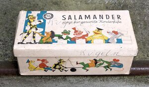 Der Schuhfabrik Salamander hatte als Werbeträger für die Kinderschuhe, den Feuersalamander „Lurchi“. Über die vielen, lustigen Abenteuer von Lurchi erfuhren die Kinder in einem Comicheft, dass sie beim Kauf dieser Schuhmarke geschenkt bekamen. Die optische Verbindung zwischen Schuhkauf und „Lurchi´s Abenteuer“ war der Schuhkarton. Darauf sind Lurchi und viele seiner Mitstreiter abgebildet. Unser Karton wurde später wohl einer Zweitverwertung zugeführt, wie der handschriftliche Hinweis „Kugeln“ vermuten lässt. ( Siehe auch Link zum Heft „Lurchi´s Abenteuer" von 1971)