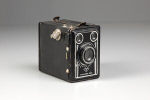 Diese Syncro Box von Agfa unterscheidet sich von Inv. Nr. 1130 nur durch ein anderes Objektiv. Es ist eine Portaitlinse 1-2 m.Die anderen Linsen zeichneten erst ab 3 Meter scharf. Ihr Zustand ist etwas besser als das vorherige Modell.