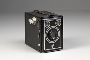 Das letzte Modell der Agfa Box 45 vor dem 2. Weltkrieg aus dem Jahr 1938. Der Auslöser befindet sich an der rechten Seite (unten vorn). Die Kennzeichen "·" und "-" geben die Einstellzeiten für die Belichtung (kurze Zeit oder beliebig lang) an. Zwei verschieden große Lochblenden und ein Gelbfilter können genutzt werden. Die Kamera besitzt eine Dekorfront. Um dem Objektiv der Kamera befinden sich Doppelringe als Verzierung und unterhalb der Verzierung ist das Agfa-Logo (Rhombus mit Agfa-Schriftzug) auf der schwarzen Metallplatte aufgetragen. Auf der Deckplatte ist ein schwarzer lederner Trageriemen mit der Prägung "AGFA-BOX" befestigt. Das Metallgehäuse ist schwarz lackiert und schwarz beledert. Objektiv: Meniskus 11/100 und Gelbfilter, Einfachverschluss. Zitat aus Museum Digital Industriemuseum Wolfen.