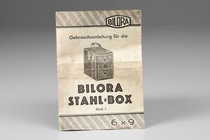 Die Bilora Box wurde von 1935, mit Unterbrechung des Krieges, bis Ende der 1950ziger Jahre in Radevormwald produziert. 1956 lief die 1.000.000ste 6X9 Box vom Band. Bilora produzierte auch für Agfa, Zeiss-Ikon und Yashica Kameras. Die Bilora Box ist im vorderen Teil zu öffnen, die Filmführung ist mit der Front fest verbunden. Sie hat, wie die Agfa Box zwei Sucher und eine einfache Meniscuslinse als Objektiv. Der Stahlkorpus ist schwarzem Kunstleder überzogen. Ihr Zustand ist sehr gut. Sie ist wahrscheinlich in den 50zigern gebaut worden.