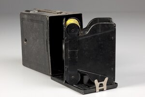 Die Balda Rollbox, vermutlich vor 1939 gebaut, ähnelt stark der Balda R-Box mit der Inventarnummer 1135. Bei beiden Kameras lässt die Rückwand abnehmen, die heraus gezogene Film-Kurbel gibt die Filmspule frei, der Film (120. Rollfim 6x9) kann getauscht werden. In der Spule liegt noch ein aufgerollter Film. Die Kunstbelederung des Stahlblechgehäuses ist etwas staubig aber noch gut. Der Chromrahmen auf der Frontseite ist rostfrei, die Kamera müsste einmal gereinigt werden.