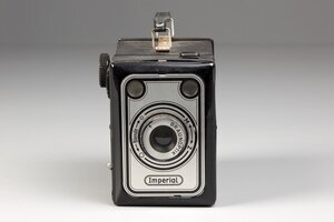 Eine Boxkamera der Firma Karl Braun KG aus Nürnberg, mit dem Titel Imperial. Der hintere Teil des Stahlblechkastens lässt sich abziehen und gibt die fest an der Front fixierte Filmspule frei. Die Frontpartie zeigt eine Aluplatte mit Öffnungen für das Objektiv und zwei Sucher. Das Stahlgehäuse ist nicht beledert, es hat eine sehr feine, samtige schwarze Oberfläche. Die Kamera ist nach 1948 gebaut worden. Die Blende, es gibt nur zwei Größen, wird mit dem Objektivring gewählt.