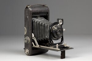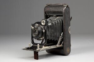 Klappkamera der Firma Carbine Modell Lukos II. Das Objektiv ist ein Aldi Uno Anastigmat F 7.7 5.5 IN. Die Kamera ist von Aussen in schlechtem Zustand, Das Innere ist um vieles besser. Scheinbar war die Kamera lange geschlossen in rauer Umgebung aufbewahrt. Über die Firma Carbine ist nicht viel bekannt, es werden nur wenige Exemplare aum dem Markt angeboten. Der Hersteller muss noch erforscht werden.