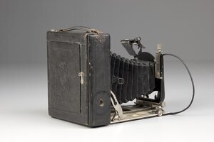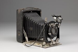 Eine Klappkamera von Dr. Staeble Werk, eine Staeble - Tricolor. Das Objektiv ist ein Doppel Anastig. Citoplast F 6.3 - 135 mm.Es ist sogar eine Laufbodenkamera, die über eine mechanische Verlängerung des Auszugs verfügt. Leider ist die Transportschraube fest corodiert, der Auszug ist blockiert. Der Rest der Mechanik ist schwergänig. Die Kamera ist beledert, ihr Zustand zum Teil rostig, die Belederung löst sich vom Blech. Mit ihr wurden Glasplatten 9x12 belichtet.