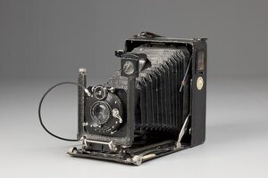 Eine Klappkamera mit verlängertem Auszug bis 13,2 cm von Voigtländer für Glasplatten 9x12. Vermutlich eine Bergheil aus den 20ziger Jahren. Ist sie geöffnet, zieht man die Objektivstandarte mit dem Balgen an das Ende des Bodens Dann wird mir einer Stellschraube die Standarte, auf einer Schiene weiter ausgezogen. Das Objektiv ist ein Kollinaer III. 13.2 1:6.8. Der Verschluss von Compur. Die Kamera ist in gutem Zustand, die Mechanik funktioniert, nur die Belederung hat Gebrauchsspuren. Auf der Rückseite gelangt man über eine Klappe und einen Faltschacht an die Glasplatte.