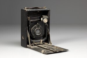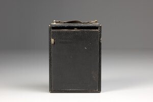 Wir sehen die Mumie einer einst guten Laufbodenkamera. Die Schiene des Laufbodens hat sich von der Platte gelöst, die Objektivstandarte liegt lose im Gehäuse. Die Kamera ist im Inneren stark verstaubt. Ein Hersteller ist nicht zu ermitteln, aber die einzelnen Teile waren einmal hochwertig. Das Objektiv ist von Jos. Schneider & Cie Bad Kreuznach, einer der besten Hersteller guter Optiken. Auf der Einstellscheibe für die Zeit ist VERO zulesen.
