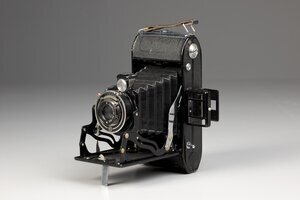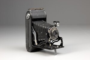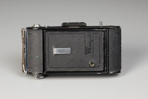 Klappkamera der Firma Wirgin aus Wiesbaden, die selten ihre Produkte unter eigenem Namen verkauften und viel für andere Hersteller arbeiteten. Diese hier ist eine "echte" Wirgin mit einem Wironar 6.3 / 105 Objektiv. Die Kamera ist in guten Zustand, alles arbeitet sauber, von Aussen hat sie Gebrauchsspuren. Sie ist wahrscheinlich kurz vor, oder kurz nach dem Krieg entstanden.