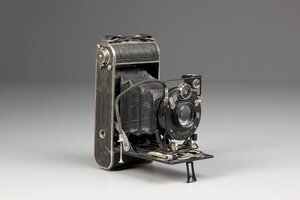 Eine Klappkamera von Voigtländer. Eine Bessa von etwa 1935. Das Objektiv, ein Anastigmat von Voigtländer ist innen verschmutz, eventuell durch einen Pilz. Die Klappmechanik ist etwas sperrig, sie müsst einmal überholt werden. Sie ist mit echtem Leder überzogen. Die Kamera arbeitet mit 120ziger 6x9 Rollfilmen
