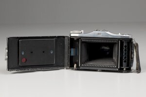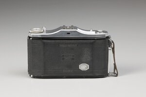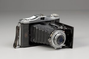Wir sehen eine Zeiss Ikon Nettar, eine Klappkamera mit optischen Sucher im Gehäuse, das aus Metallguss mit Kunstbelederung besteht. Sie öffnet sich nach links um den Balgen aus zu fahren. Das Objektiv ist ein Novar-Anastigmat 1:4.5/105 mm. Mit ihr werden 120ziger Rollfilme 6x9 belichtet. Die Kamera befindet sich in gutem Zustand. Sie war, gebaut von 1951 - 1956, in den 50ziger Jahren sehr beliebt.