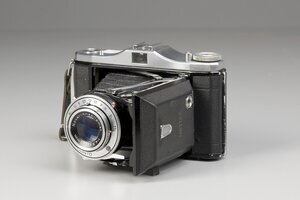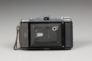 Wir sehen eine Zeiss Ikon Nettar, eine Klappkamera mit optischen Sucher im Gehäuse, das aus Metallguss mit Kunstbelederung besteht. Sie öffnet sich nach links um den Balgen aus zu fahren. Das Objektiv ist ein Novar-Anastigmat 1:4.5/105 mm. Mit ihr werden 120ziger Rollfilme 6x9 belichtet. Die Kamera befindet sich in gutem Zustand. Sie war, gebaut von 1951 - 1956, in den 50ziger Jahren sehr beliebt.