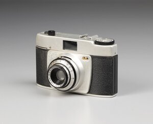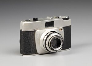 Eine Sucherkamera von Dacora aus den 50ziger Jahren. Dacora gab es von 1946 bis 1972 in Reutlingen und München. Die Kamera ist wahrscheinlich eine Dignette, das genaue Modell konnte ich nicht finden. Der Korpus aus Aluguss ist mit Kunstleder überzogen. Das Objektiv, ein Dr. Schleussner Adoxar 1:3,5 f-45 mm, ist innen blind, die Alufront corodiert. Das Lederetui hat am Objektiv ein großes Loch.