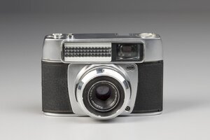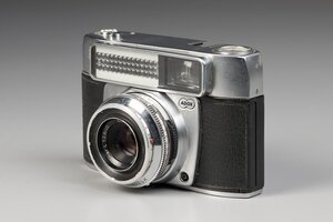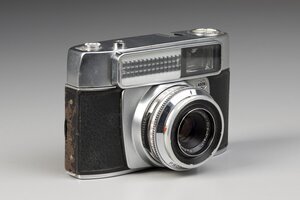 Eine Sucherkamera von Adox, eine Polomat 1S für 35iger Kleinbildfilm. Sie hat mit dem Schneider Kreuznach Radionar L 1:2.8 45 mm eine exzellente Optik, der Verschluss ist ein Prontor 500LK. Er arbeitet noch, aber die Filmtransportkurbel ist blockiert. Die gewählte Blende ist im hellen Sucherbild am oberen Rand ab zu lesen. Von Aussen ist die Kamera etwas verschmuzt. Sie wurde nur von 1962 bis 1963 produziert.