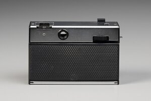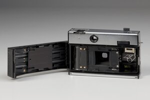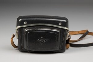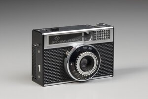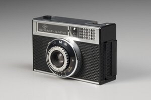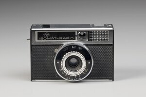 Hier ist eine Isomat-Rapid von Agfa zu sehen. Es ist eine Messsucherkamera mit einer Belichtungsautomatik, die nur einen kleinen Arbeitsbereich hat. Sie arbeitet mit Agfa - Rapid Patronen, das sind Filmkassetten (24x24) die die Kamera erkennt und die Din-Zahl richtig wählt. Sie wählt automatisch die Blende, im Blitzbetrieb bei 1/30 und einer 1/70 Sekunde in der Automatik. Sie wurde von 1966 bis 70 gebaut. Ihr Zustand ist gut.