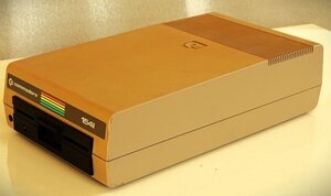 5 1/4-Zoll-Diskettenlaufwerk mit der Typenbezeichnung VC 1541. Das Laufwerk kam 1982 auf den Markt und war ein eigenständiger Computer mit eigenem Prozessor und Speicher. Als Betriebssystem wurde das von der Firma Commodore entwicklete DOS-System verwendet. Der Prozessor ähnelt dem im Commodore C 64 verwendeten Rechenwerk. Da das Laufwerk nur einen Schreib/Lese-Kopf besitzt, konnten Disketten nur einseitig beschrieben werden. Zum Beschreiben der Rückseite musste die Diskette herumgedreht werden. Die Gehäusefarbe war mit der Gehäusefarbe des zu dieser Zeit angebotenen Heimcomputers identisch. Das im Besitz des Freilichtmuseums Roscheider Hof befindliche Laufwerk hat eine beige Gehäusefarbe. Diese Modellreihe wurde als 2. Generation 1986 in den Markt eingeführt. 1988 gab es eine 3. Generation dieses Laufwerkes. Das Gehäuse war deutlich kleiner und hatte eine hellgraue Farbe.