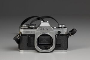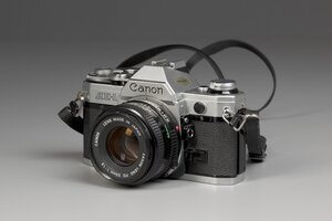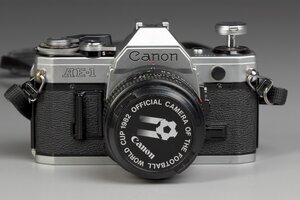 Mit der Canon AE-1 setzte Canon ab 1976 an die Spitze der verkauften SLR-Kameras. 1984 wurde die Produktion eingestellt, bis dahin waren 5,7 Millionen Stück verkauft. Sie war die erste Spiegelreflexkamera mit elektronischer Blendenautomatik. ab 1981 wurde sie von der AE-1 Programm verdrängt, siehe Inv. Nr TON 1178. Mit der AE-1 liess sich sehr gut arbeiten, alles saß am richtigen Platz, ihr silbernes Gehäuse mit schwarzer Kunstbelederung aus Aluminium-Guss war robust und wog nur 600g. Die Objektive mit dem Canon FD Bajonett waren bequem zu wechseln. Mit Druck auf den Auslöseknopf wurde ein elektrischer Kontakt geschlossen, in der AE-1 waren zum erstenmal Mikro-Prozessorenmverbaut. Auf dem Objektivdeckel dieser Kamera ist zu lesen, dass die Ae-1 die offizielle Kamera der Fussball WM 1982 ist. Ob der Deckel zur Kamera gehört ist nicht bekannt.