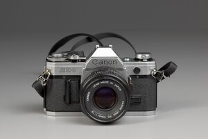 Mit der Canon AE-1 setzte Canon ab 1976 an die Spitze der verkauften SLR-Kameras. 1984 wurde die Produktion eingestellt, bis dahin waren 5,7 Millionen Stück verkauft. Sie war die erste Spiegelreflexkamera mit elektronischer Blendenautomatik. ab 1981 wurde sie von der AE-1 Programm verdrängt, siehe Inv. Nr TON 1178. Mit der AE-1 liess sich sehr gut arbeiten, alles saß am richtigen Platz, ihr silbernes Gehäuse mit schwarzer Kunstbelederung aus Aluminium-Guss war robust und wog nur 600g. Die Objektive mit dem Canon FD Bajonett waren bequem zu wechseln. Mit Druck auf den Auslöseknopf wurde ein elektrischer Kontakt geschlossen, in der AE-1 waren zum erstenmal Mikro-Prozessorenmverbaut. Auf dem Objektivdeckel dieser Kamera ist zu lesen, dass die Ae-1 die offizielle Kamera der Fussball WM 1982 ist. Ob der Deckel zur Kamera gehört ist nicht bekannt.
