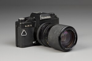 Auch eine Rolleiflex SL 35 E, nur ist sie schwarz und hat einen Winder, ein Motor für den Filmtransport, der unter ihrem Boden befestigt ist. Sie ist baugleich mit vorherigen Rolleiflex siehe Inventar Nr. TON 1180. An ihr befindet sich ein Rolleinar Zommobjektiv 1: 3.5 - 4.3 / 35 - 105 mm. Innen gut, Aussen schmutzig. Auch hier Schwierig keiten mit dem Auslöser. Er kommt nach dem Auslösen nur langsam wieder hoch, vielleicht ist die Mechanik nur verharzt.