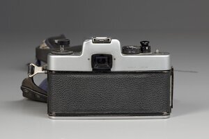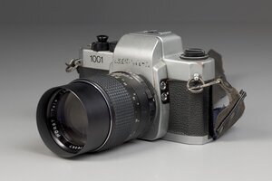 Eine noch zu rettende Ruine einer analogen einäugigen Spiegereflexkamera für Kleinbildfilm 24x36 mm, einer Revueflex 1001 von Quelle/Revue von 1976. Die Kamera wurde von Quelle/Revue geplant und vertrieben, wahrscheinlich in Asien gebaut. Ihr Alugussgehäuse ist stark verschmutz, die Beschriftung gerade noch lesbar. Sie hatte einen Belichtungsmesser eingebaut, alles andere wurde manuell gesteuert. Mit einem M 42 Gewindeanschluss wurden die Objektive fixiert. Auf dem Prisma ist ein Blitzschuh angebracht. Des Auslöseknopf ist blockiert, er wackelt auf dem Gehäuse. Die Spannkurbel für den Film fehlt, der Stift darunter ist noch übrig. Der Klappspiegel ist verschmuzt, aber vielleicht nicht beschädigt. Mit etwas Aufwand könnte sie gerettet werden.