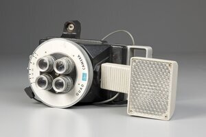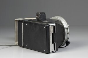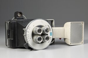 Hier wird ein kameratechnisches Unikum gezeigt. Eine Polaroid Quad Camera, eine Sofortbildkamera die 4 Aufnahmen gleichzeitig tätigt. Sie wurde meistens für Passbilder gebraucht. Die Rückwand bildet die Belichtungs und Entwicklungs einheit, auf ihr sitzt ein schwarzer, gegossener, sich verjüngender Kamreakörper auf dem starke etwa 120 mm im Durchmesser, dicke helle Scheibe mit 4 Objektiven montiert ist. Ein Objektiv hat gesprungene Linsen. Am Kamerakörper ist ein großer, auch aus Metallguss bestehender Blitz angebracht. Über ein zweites Kabel ist er mit Auslöser synchronisiert. Für eine Aufnahme wird in die Rückwand das Bildmaterial eingelegt, belichtet, eine Minute gewartet, dann wird das fertige Bild aus dem Schlitz gezogen. Sind die Bilder ganz trocken können sie geteilt werden. Die Kamera ist stark verschmuzt, könnte aber bis auf das zerstörte Objektiv noch arbeiten.