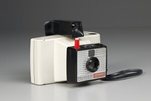 Die Sofortbildkamera Polaroid Swinger Model 20 ist für den Rollfilm 20 Mitte der 60ziger Jahre für den Massenmarkt entwickelt worden. Sie hat ein weisses Kunststoffgehäuse, das eine Dicke abgeschrägte Rückwand hat. Nach vorne gbt es einen sich verjüngenden Quarder, der die Front mit Auslöser, Objektiv und dem Blitz trägt. So wurde fotografiert: der Film mit 8 Bildern wird eingelegt vorgezogen und in den Schlitz an der blauen Taste eingefädelt, dann wird belichtet 10-15 Sekunden gewartet, die blaue Taste gedrückt und der Film an der Kante abgerissen, schnell das Bild vom Negativ ablösen und mit eienm Lackschwämmchen bestreichen. Für den Blitz werden Blitzröhren Ag 1 benötigt. Die Kamera ist für ihr Alter etwas schmutzig. So eine weisse glatte Oberfläche bleibt nicht lange so.