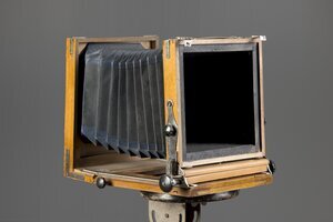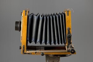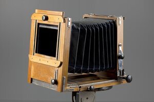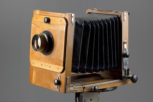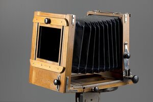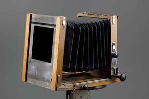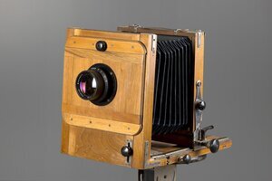 Eine Grossformat-Reise-Kamera eines unbekannten Herstellers, geschätzt von 1900 bis 1930. Sie besteht aus einem geteilten Holzboden mit rechts und links einem festen Zahnband auf dem vorne und hinten, 2 bewegliche Holzrahmen montiert sind. Die hintere ist die Bildstandarte, die vordere die Objektivstandarte. Leider fehlt an der Bildstandarte der Rahmen der die Glasplatten trägt.Beide Standarten sind mit einem lichtdichten Faltbalgen aus Leder und Stoff miteinander verbunden. Mit dem Abstand der Standarten wird fokussiert und durch drehen und schwenken kann die Bildqualität verbessert werden. Eigentlich kann die Bildstandarte bis ganz nach vorne gebracht werden, dann kann der Boden dahinter hochgeklappt werden, die Kamera ist kompakt und mit einem Ledergriff wegtragen, leider bleibt die Bildstandarte ganz vorne stecken. Die Objektivstandarte hat zwei waagerechte Halte-Leisten, zwischen die eine Platte mit dem Objektiv eingeschoben wird. Die Kamera ist nicht all zu sauber, einige Stellschrauben sind aus geleiert, so bleibt sie ein Anschauungsmodell. Aber ein schönes!