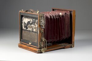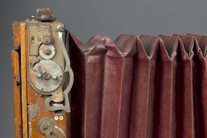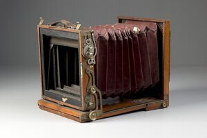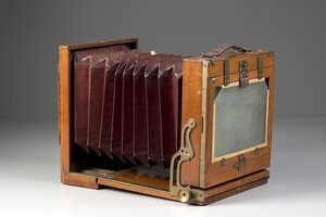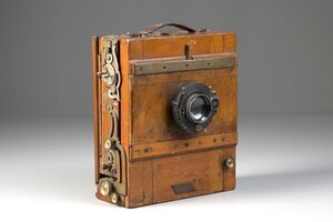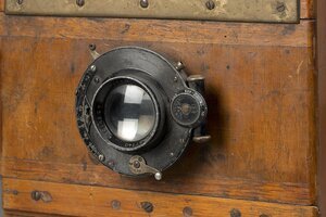 Eine Grossformat-Reise-Kamera eines unbekannten Herstellers, geschätzt von 1900 bis 1930. Sie besteht aus einem geteilten Holzboden mit rechts und links einem festmontierten Messingzahnband auf dem vorne und hinten, 2 bewegliche Holzrahmen montiert sind. Der hintere ist die Bildstandarte, der vordere die Objektivstandarte.Beide Standarten sind mit einem lichtdichten rotenFaltbalgen aus Leder miteinander verbunden. Mit dem Abstand der Standarten wird fokussiert und durch drehen und schwenken kann die Bildqualität verbessert werden. Die Bildstandarte kann bis ganz nach vorne transportiert werden, dann wird der Boden dahinter hochgeklappt, die Kamera ist kompakt, wird mit einem Messingriegel verschossen und mit einem Ledergriff wegtragen. Die Objektivstandarte hat zwei waagerechte Halte-Leisten, zwischen die eine Platte mit dem Objektiv eingeschoben wird, hier ein Steinheil München Unofocus 1:4.5 f = 15 cm. Die Kamera wurde über Kieser & Pfeifer München vertrieben, sie hat Gebrauchsspuren, alle Stellschrauben arbeiten, nur die Ojektivmechanik ist vollkommen blockiert, aber sie ist ein sehr schönes Ausstellungs-Exponat.
