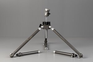 Ein Universalstativ von Pentacon/ DDR aus, mit grauem Hammerschlag lackierten, Stahlrohren. Aus einem sechskantigen ragen aus drei Seiten kurze Alurohre mit einem Schlitz nach unten in denen Alu- Kugeln stecken, an denen die drei Beine befestigt sind. Mit einer kräftigen Schraube können die Beine in jedem Winkel festgestellt werden. Das Stativ passt sich jeder Umgebung an. Auf dem Sechskant sitzt eine grosse Fesstellmutter die die Mittelsäule fixiert. Diese kann herausgezogen und umgedreht werden und die Kamera wird verkehrt herum auf gehängt. Die Beine können ausgezogen und noch um eine drei weitere Elemente verlängert werden. Das Stativ ist nur für Kleinbildkameras geeignet. Es sieht nich aus wie neu, funktioniert aber gut.