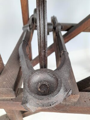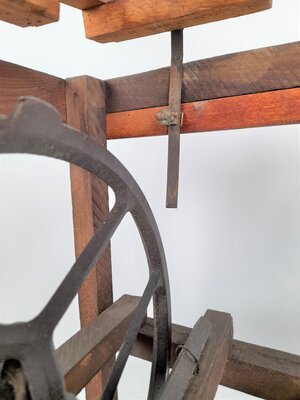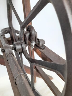 Das Untergestell dieses ungewöhlichen Spinnrades wurde aus Latten zusammengenagelt. In dieses Gerüst eingefügt wurden das gusseiserne Trümmerteil eines Nähmaschinengestelltes zum Tragen der Achse und das Schwungrad einer Nähmaschine als Antriebsrad. Die Spinnvorrichtung sitzt oben auf einem Lattenrahmen, der mittels eines Metallstreifens höher oder tiefer gestellt werden kann, um die Treibriehmenspannung zu verändern. Der Spinnflügel wurde grob handwerklich aus geschnitzten Armen mit Bohrungen für die Fadenführung, einer gedrechselten Hohlform (ev. einem Eierbecher) und einem aus Blech geformten Trichter als Faserloch zusammengebastelt. Das Spinnrad ist aber durchaus funktionstüchtig und weist Arbeitsspuren auf. Dieses Spinnrad kam bereits 1975 in das Museum. Der Vorbesitzer datierte das Objekt auf 1946.