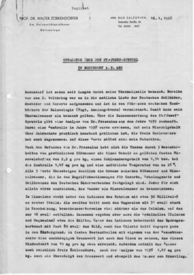 Das Gutachten zur Thermalquelle wurde im Auftrag der Amtsverwaltung Remagen aufgrund von Heilwasseranalysen erstellt. Es sollte den Fragen der Eignung des Wassers zu Heilzwecken nachgehen und seine Heilanzeigen feststellen, gegebenenfalls als Unterlage für ein Anerkennungsverfahren (Bad-Titelzuerkennung) dienen. Das Gutachten bezieht sich die amtliche Liste der Deutschen Heilbäder, Seebäder und Kurorte und die Handbücher der Baldnelogie (Vogt, Amelung-Evers) und auch auf Gutachten von Fresenius (1939 und 1958). Auf den 4 Seiten des Gutachtens sind die Indikationsmöglichkeiten mit dem Bodendorfer Heilwasser aufgeführt.