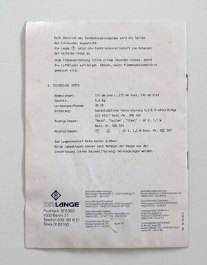 Verdünungs- und Dosiergerät für die Vorbereitung flammenphotometrischer Analysen. Das beschriebenen Gerät wird in der Mikrobiologie und chemischen Analytik eingesetzt. Im Gerät befindet sich eine Pumpe zum Ansaugen des Probenmaterials und eine zweite Pumpe zur Dosierung der Verdünungslösung. Eine Lösung wird mittels eines Zersteubers in eine Flamme geleitet und danach die Verfärbung gemessen. Die in deutscher Sprache verfasste Betriebsanleitung für den Dilutert LD 2 besteht aus 8 Seiten im DIN A 5 hoch Format. Beschrieben werden darin die Ausstattung des Gerätes, die Funktionsweise und der Betrieb. Außerdem beinhaltet die Broschüre Hinweise zur Aufstellung und zum Anschluß sowie eine Übersicht zu den technischen Daten. Es befinden sich 2 identische Exemplare der Bedienungsanleitung im Besitz des Freilichtmuseums Roscheider Hof.
