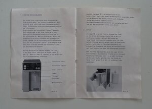 Verdünungs- und Dosiergerät für die Vorbereitung flammenphotometrischer Analysen. Das beschriebenen Gerät wird in der Mikrobiologie und chemischen Analytik eingesetzt. Im Gerät befindet sich eine Pumpe zum Ansaugen des Probenmaterials und eine zweite Pumpe zur Dosierung der Verdünungslösung. Eine Lösung wird mittels eines Zersteubers in eine Flamme geleitet und danach die Verfärbung gemessen. Die in deutscher Sprache verfasste Betriebsanleitung für den Dilutert LD 2 besteht aus 8 Seiten im DIN A 5 hoch Format. Beschrieben werden darin die Ausstattung des Gerätes, die Funktionsweise und der Betrieb. Außerdem beinhaltet die Broschüre Hinweise zur Aufstellung und zum Anschluß sowie eine Übersicht zu den technischen Daten. Es befinden sich 2 identische Exemplare der Bedienungsanleitung im Besitz des Freilichtmuseums Roscheider Hof.