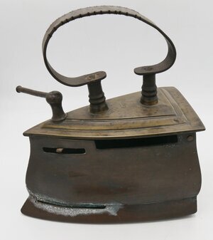 Bügeleisen aus Messing mit einem runden Griff. Der Decke kann hochgeklappt werden um in den Bauch des Bügekeisens Kohleglut einzufüllen. Der mit einem großen Ornament verzierte Deckel ist mit einem Schanier am Ende des Bügeleisen mit dem Körper dessen verbunden. An der Spitze des Bügeleisens befindet sich ein Drehknopf mit einem Hebel. Mit diesem kann eine Verrieglung hergestellt bzw. gelöst werden. Inschrift auf dem Messingdeckel "FAGLER IN SZEGEDIN" , Ungarn