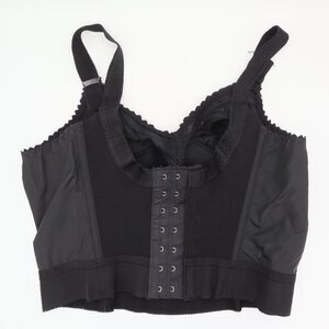 Langer Büstenhalter der Marke Gescha aus schwarzer Spitze mit elastischen Einsätzen. Die Träger-Schieber haben das für die Marke typische Rosenmotiv. Laut Schild handelt es sich um das Modell 5380, es schließt hinten mit Haken und Ösen.