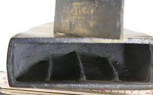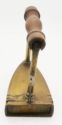 Kleines Flachbolzenbügeleisen (Kastenbügeleisen, Reisebügeleisen) aus Messing z.B. für die Reise mit schiffförmigem Rumpf. In den Rumpf kann ein erhitzter Bolzen von hinten eingeführt werden. Mit diesem wird der Boden des Bügeleisens erhitzt. Der Innenraum kann mit einem von oben eingeführten Schieber mit Stiel und Griff verschlossen werden, sodass der Eisenkeil nicht nach hinten herausfallen kann. Hierzu befindet sich am hinteren breiten Ende die Schiebeklappe, die vertikal beweglich ist, um den heißen Bolzen einrühren zu können. Der hölzerne Griff ist mit 2 relativ langen Stiften mit dem eigentlichen Bügeleisen verbunden. Im Inneren befinden sich unten 3 Rippen die verhindern, dass der Eisenkeil direkt auf dem Boden aufliegt. Der Bolzen ist leider nicht mehr vorhanden.