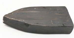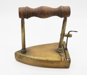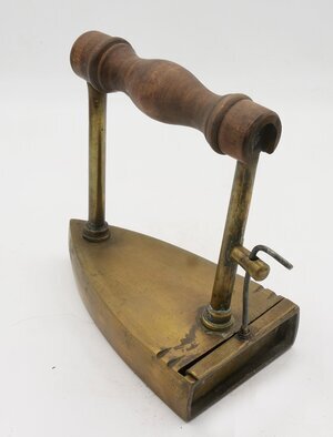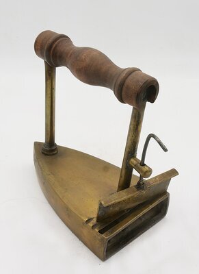 Kleines Flachbolzenbügeleisen (Kastenbügeleisen, Reisebügeleisen) aus Messing z.B. für die Reise mit schiffförmigem Rumpf. In den Rumpf kann ein erhitzter Bolzen von hinten eingeführt werden. Mit diesem wird der Boden des Bügeleisens erhitzt. Der Innenraum kann mit einem von oben eingeführten Schieber mit Stiel und Griff verschlossen werden, sodass der Eisenkeil nicht nach hinten herausfallen kann. Hierzu befindet sich am hinteren breiten Ende die Schiebeklappe, die vertikal beweglich ist, um den heißen Bolzen einrühren zu können. Der hölzerne Griff ist mit 2 relativ langen Stiften mit dem eigentlichen Bügeleisen verbunden. Im Inneren befinden sich unten 3 Rippen die verhindern, dass der Eisenkeil direkt auf dem Boden aufliegt. Der Bolzen ist leider nicht mehr vorhanden.