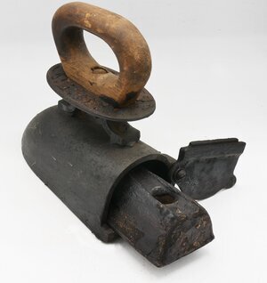 Der Name "Ochsenzungenbügeleisen" kommt daher, weil in das Innere des Bügeleisens ein ochsenzungenförmiger Eisenkeil von hinten eingeschoben werden kann. Dieser wird zuerst auf einem Herd erhitzt, dann eingeschoben und damit der Boden des Bügeleisens erhitzt. Der Innenraum kann mit einer Klappe verschlossen werden, sodass der Eisenkeil nicht nach hinten herausfallen kann. Der hölzerne Griff sitzt auf einer eigenen Bühne über dem eigentlichen Bügeleisen. Die Bühne ist mit diesem durch 2 Eisenbügel verbunden. Der Eisenkeil trägt die Bezeichnung 1 1/2. Am Boden des Innenraums findet sich eine Rippe in Form eines Bischofsstabs die verhindert, dass der Eisenkeil direkt auf dem Boden aufliegt. In der Biegung des Stabs befindet sich als Gussmarke die Zahl 21.