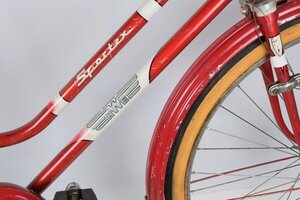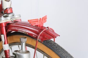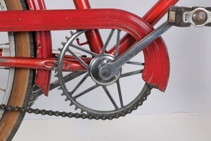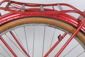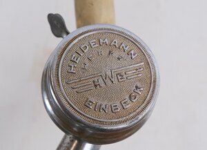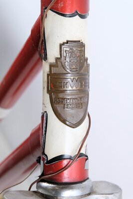 Die Firma Heidemann & Co, Fahrradfabrik aus Einbeck, war eine Tochter der Baronia Fahrzeugfabrik, Bielefeld. Das Damenrad hat eine Größe von 26 Zoll und wurde unter der Fabriknummer 363 604 in Einbeck hergestellt. Ob die rote Farbe das Original ist, konnten wir nicht klären. Zumindest weisen Unsauberkeiten auf ein späteres nachlackieren hin. Auch die Felgen wurden später einmal ausgetauscht, denn sie sind für den Gebrauch einer Felgenbremse konstruiert, während am Lenker die alte Stempelbremst verbaut ist. Das Steuerkopfschild, aus Metall, trägt das Firmenloge. Am Rahmen ist ein Abziehbild HWE (Heidemann Werke) angebracht, am vorderen Schutzblech ein Kunststofflogo. Am hinteren Schutzblech sind die Löcher zum Einhängen eines Rocknetzes vorhanden. Die Nabe am Hinterrad ist von Fichtel und Sachs, eine „Komet Super“. Sie ist etwas einfacher im Aufbau als die F&S Torpedo Nabe, dafür preisgünstiger.