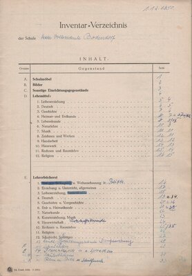 Das Inventar-Verzeichnis ist ein Vordruckheft aus 43 Seiten mit einem blauen Einband. Am Ende des Heftes sind die Seiten 44 und 45 aus kartiertem Papier mit senkrecht gezeichneten Linien, wie in dem Vordruckheft, angeführt. Insgesamt werden 146 Zeilen mit Auflistung des Inventars beschrieben, wobei die Zeilen 135 bis 146 auf der Innenseite der hinteren Umschlagseite eingetragen wurden. Auf Seite 3 befindet sich das Inhaltsverzeichnis. Untergliedert ist die Inventarliste in A. Schulmöbel (Seite 1), B. Bilder (Seite 2), C. Sonstige Einrichtungsgegenstände (Seite 4), D. Lehrmittel (Untergliedert nach Schulfächern), E. Lehrerbücherei (Untergliedert nach Schulfächern), handschriftlich angefügt F. Schulakten, E. G. Französisch und Sprachen, H. Schülerbücherei und K. Filme und K. Filme, Bilder und Schulforschung.
