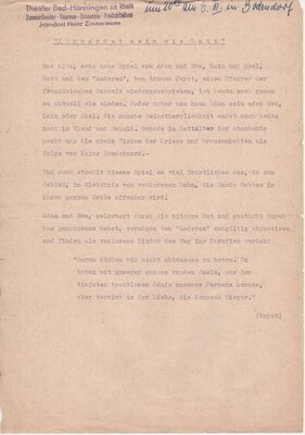 Die Kath. Volksschule bestellte bei der Buchhandlung Dreesbach in Remagen Bücher für die Schulbücherei 15 Bücher, die noch vor Schluss des laufenden Etatjahres geliefert werden sollten. Einige Bücher wurden handschriftlich zusätzlich auf der Bestellung nachgetragen. Bei den Preisen wurde handschriftlich neben dem Bestellpreis der aktuelle Preis geschrieben. Bei dem Dokument handelt es sich um eine Kopie (Durchschlagpapier) der Bestellung, die auf der Rückseite einer Vorstellungsankündigung des Theater Bad Hönningen.